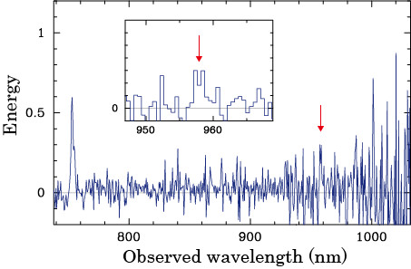 [caption id="attachment_89589" align="aligncenter" width="453" caption="The deep optical spectrum of TN J0924-2201 obtained with FOCAS on the Subaru Telescope. The red arrows point to the carbon emission line."]