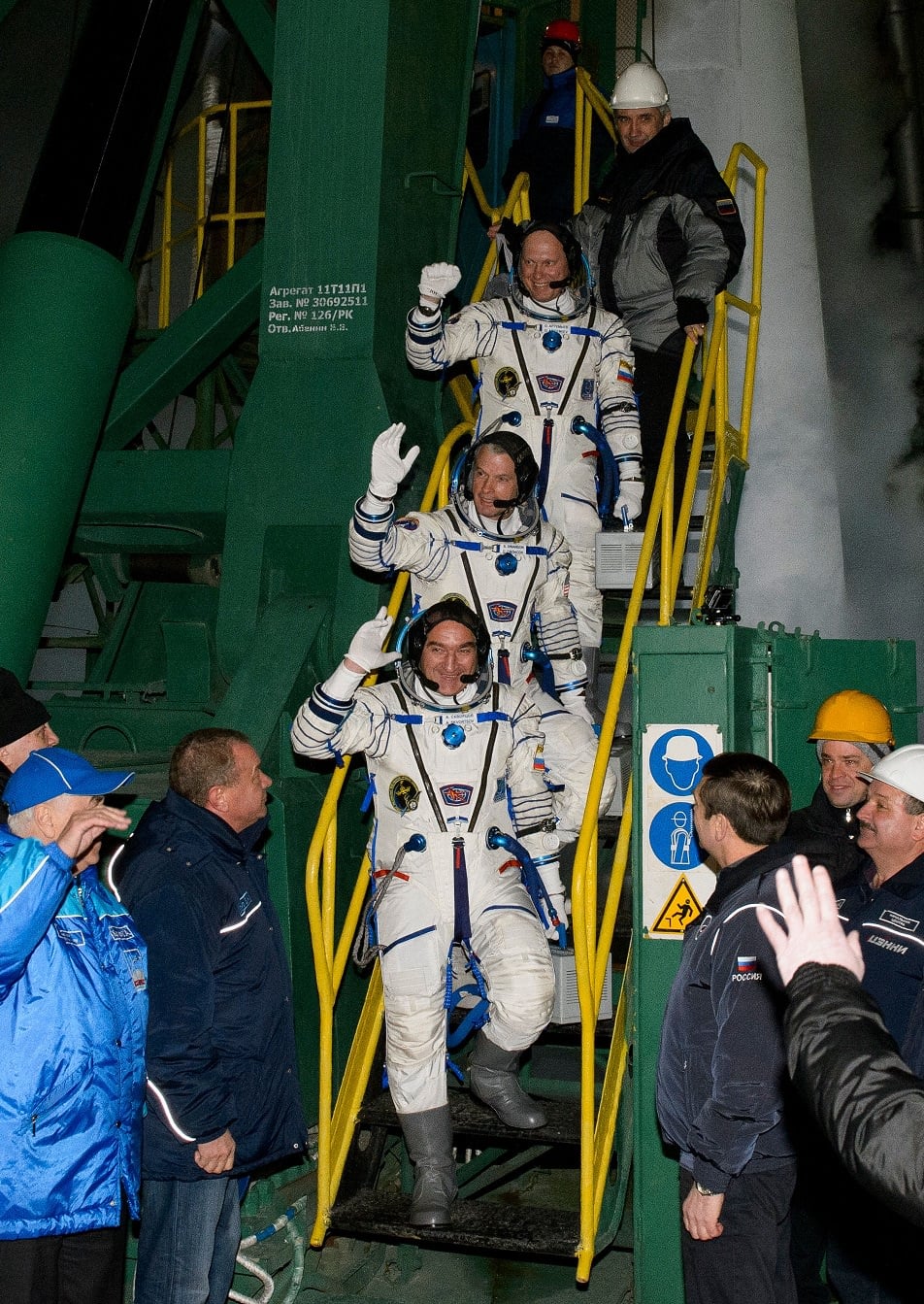 The Soyuz crew includes Steve Swanson (NASA), Alexander Skvortsov (Roscosmos) and Oleg Artemyev (Roscosmos). Awaiting them on the station are Koichi Wakata (Japan Aerospace Exploration Agency), Rick Mastracchio (NASA) and Mikhail Tyurin (Roscosmos). Wakata is in command of the station, marking a first for Japan's astronaut corps.