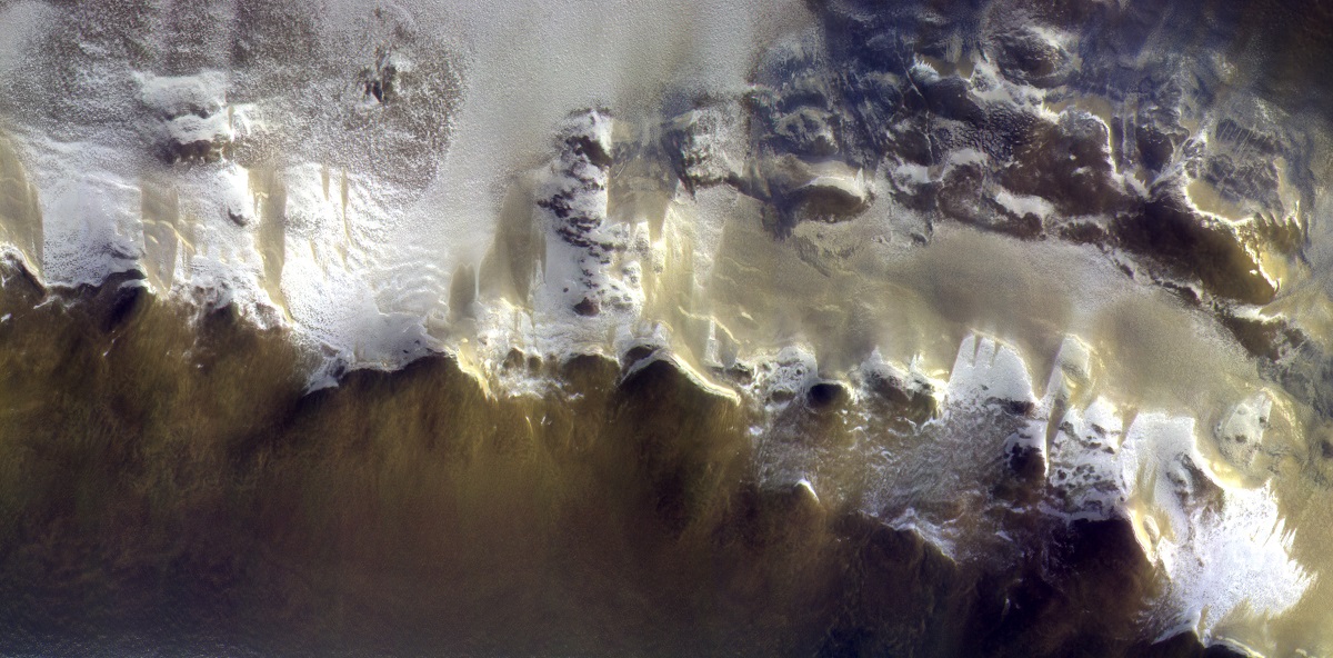 The ExoMars Colour and Stereo Surface Imaging System, CaSSIS, captured this view of the rim of Korolev crater (73.3ºN/165.9ºE). Copyright ESA/Roscosmos/CaSSIS[/caption]