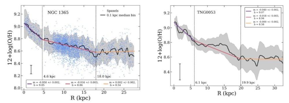 These panels compare the oxygen-derived metallicity of NGC 1365 from TYPHOON with the same from the Illustris TNG0053 simulation. "Solid black lines show the median metallicity as a function of radius, and the shaded regions show the standard deviation from the median. The three colored lines show the best-fit linear fits to the radial metallicity gradient. The vertical lines show the locations of the breaks in the linear fits," the authors explain. Image Credit: Kewley et al. 2026. NatAstr.