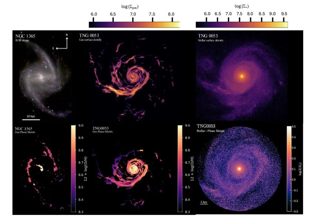This figure shows how the researchers matched NGC 1365 with the TNG0053 simulation from Illustris TNG. "The TYPHOON RGB image and gas-phase metallicity maps of NGC 1365 are compared with the face-on projections of the z=0 distributions in TNG0053 of gas and stellar surface density, gas-phase metallicity, and stellar metallicity," the researchers explain. Image Credit: Kewley et al. 2026. NatAstr.