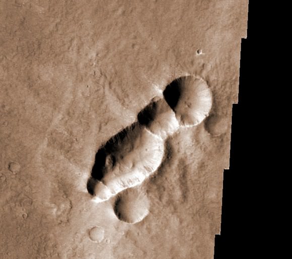 Martians obviously have a sense of humor. This 2-mile-wide (3 km) unnamed crater was photographed in 2008 by the Mars Reconnaissance Orbiter.