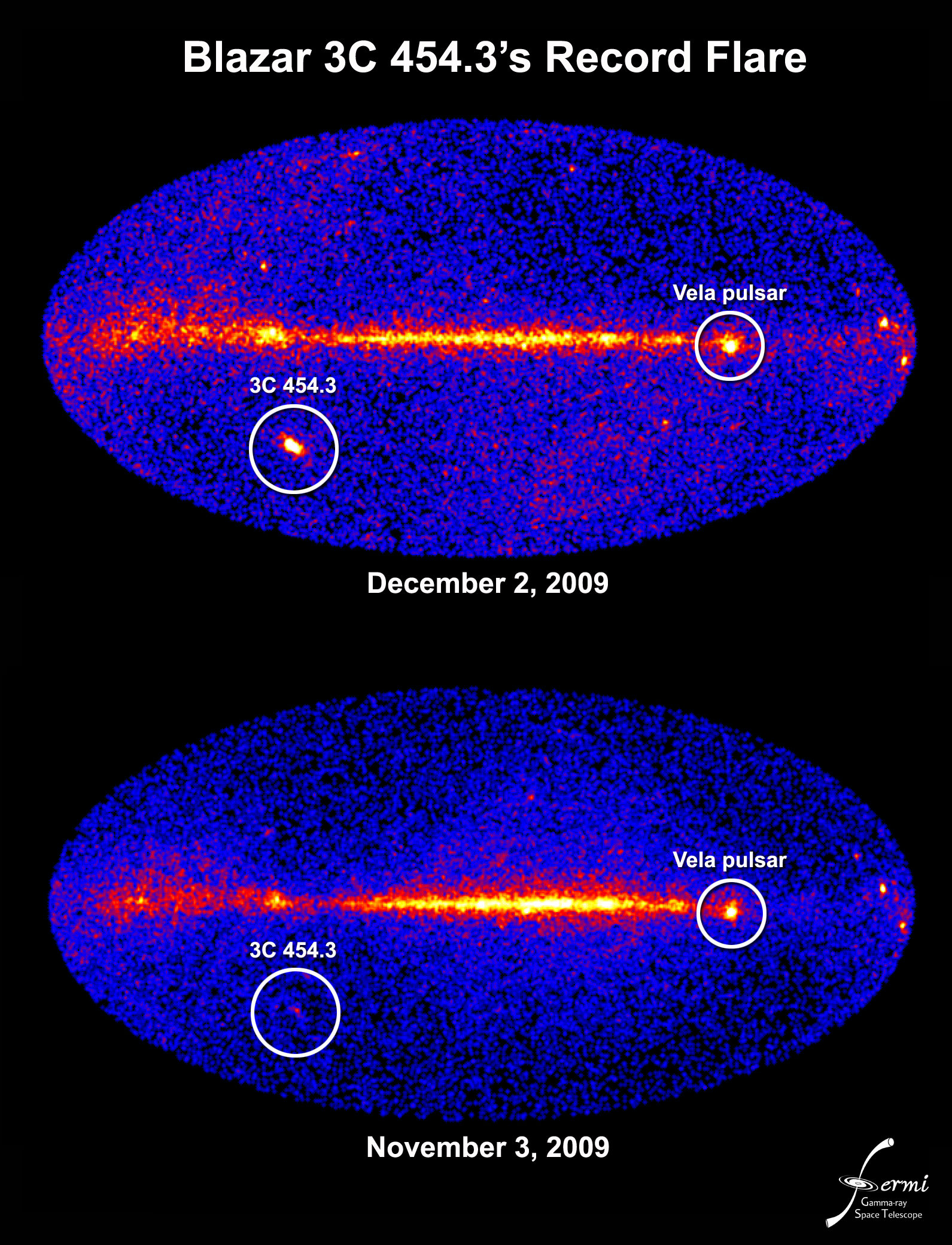 This blazar has started to outshine the Vela pulsar, which because it is only 1,000 light-years away from the Earth is generally the brightest gamma-ray source in the sky. 3C 454.3 is almost twice as bright as Vela in the gamma-ray part of the spectrum, even though it lies 7 million times further away from the Earth. 3c 454.3 has also brightened significantly in the infrared, X-ray, radio and visible light.