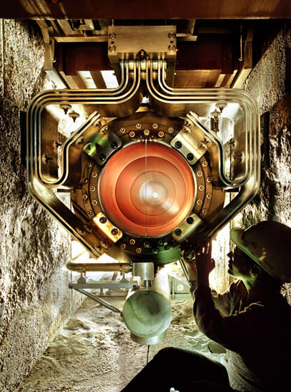 Using entirely different methods, the two neutrino experiments went to work. To measure the transformation of muon neutrinos into other neutrinos, the MINOS experiment sends a muon neutrino beam 450 miles (735 kilometers) through the Earth from the Main Injector accelerator at Fermilab to a 5,000-ton neutrino detector, located half a mile underground in the Soudan Underground Laboratory in northern Minnesota. The nearly twin detectors have different purposes. At Fermilab the purity of the muon neutrino beam is calibrated while Soudan detects electron and muon activity. It's a fast trip, too...but just one four hundreths of a second is all it takes for these incredibly tiny particles to transform.