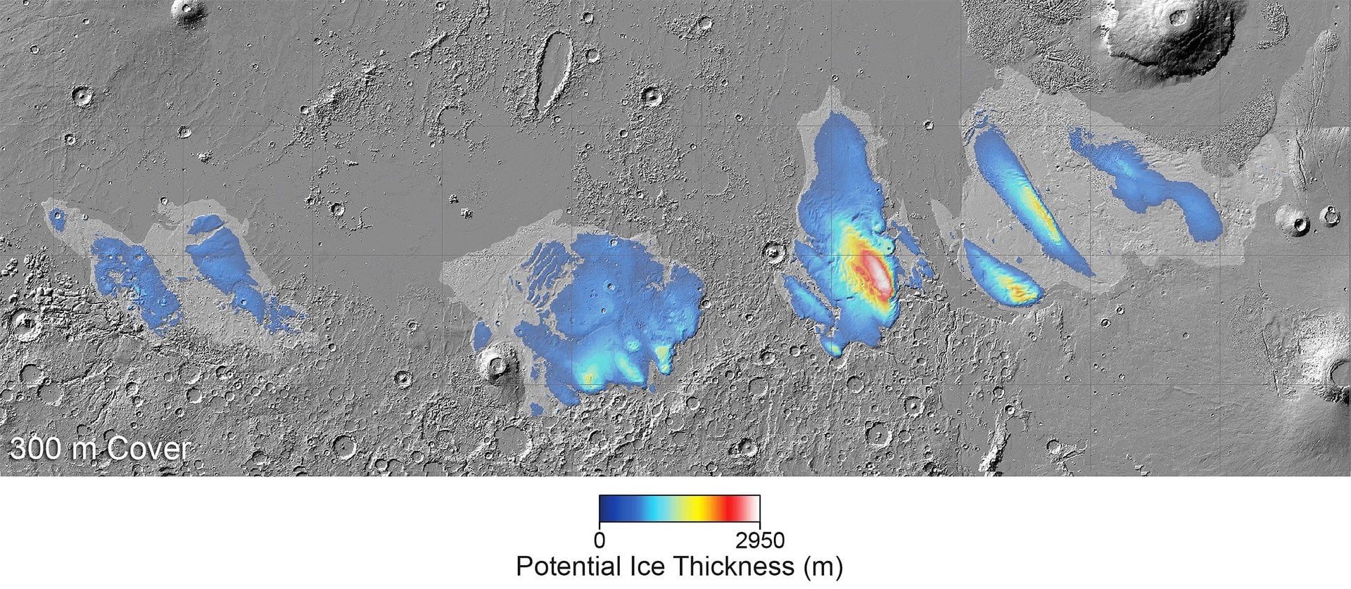 This map shows the ice thickness at Mars’s Medusae Fossae Formation (MFF) if we assume that the dust is 1000 feet thick. In this case, the total volume of water ice contained within the MFF deposits, if it melted, would be enough to cover Mars in an ocean of water approximately 3 metres deep (Credit: ESA) This map shows the ice thickness at Mars’s Medusae Fossae Formation (MFF) if we assume that the dust is 1000 feet thick. In this case, the total volume of water ice contained within the MFF deposits, if it melted, would be enough to cover Mars in an ocean of water approximately 3 metres deep (Credit: ESA)