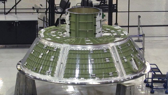 [caption id="attachment_65045" align="alignleft" width="580" caption="Interior view of Cone Assembly and crew hatch welded to the mid-ring (silver colored) at base. The 5 meter diameter Cone Assembly weighs about 650 lbs and will be welded to the Aft Assembly. The 18 cm thick mid-ring joins the barrel of the Aft Assembly to the Cone. The bent "T" shaped ring adds stiffness to the structure and also provides an attach point for the aeroshell support structure. Credit: Lockheed Martin"]