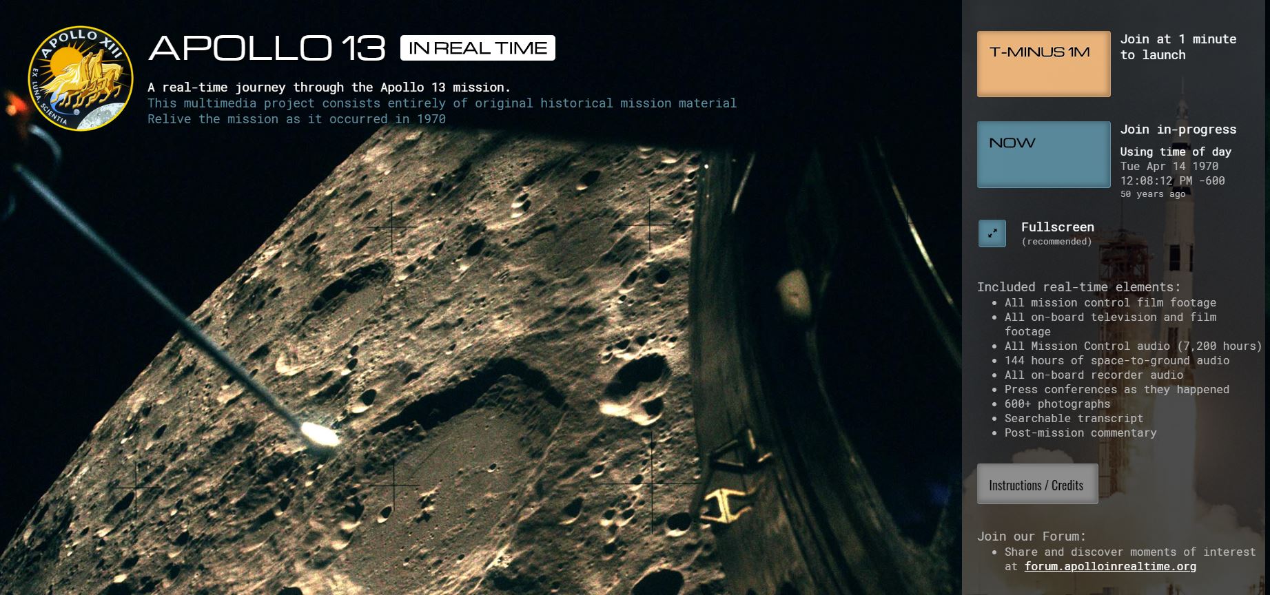 On the site right now, you can join the mission at launchtime, or "in progress." But starting April 10, you'll be able to join in "right now" exactly 50 years later. As I found during using the Apollo 11 in Real Time Site during the Apollo 11 anniversary, it's quite emotional to be connected to what was unfolding exactly 50 years ago. It really transported me through time, and I expect the same thing to happen for Apollo 13.