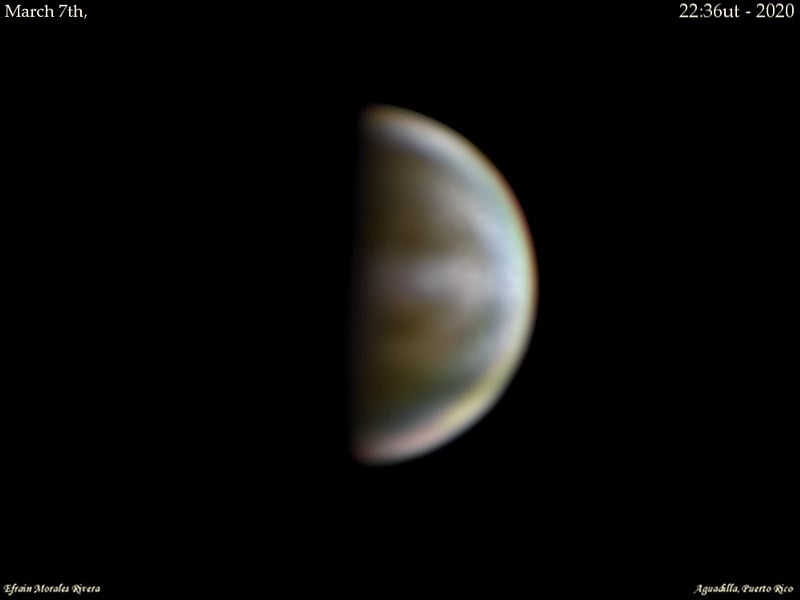 Now, greatest elongation is the point where the Earth, Venus and the Sun form an imaginary right triangle through the inner solar system… Venus 'should' appear as a tiny half illuminated disk right on this date. Over the centuries, however, observers have noticed that this event, known as ' dichotomy,' tends to fall a few days late. Possible explanations for this discrepancy include the thick atmosphere of Venus refracting sunlight along the terminator… or perhaps, it's just a simple optical illusion. In 2020, theoretical dichotomy is expected to occur three days after greatest elongation on March 27th. When does Venus appear exactly half-illuminated to you?