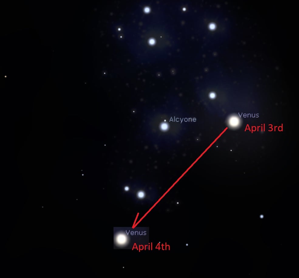 Another spectacular pairing involving Venus occurs in early April, when the planet passes through the Pleiades star cluster (Messier 45) on April 3rd. The last time the two met was eight years ago in 2012.
