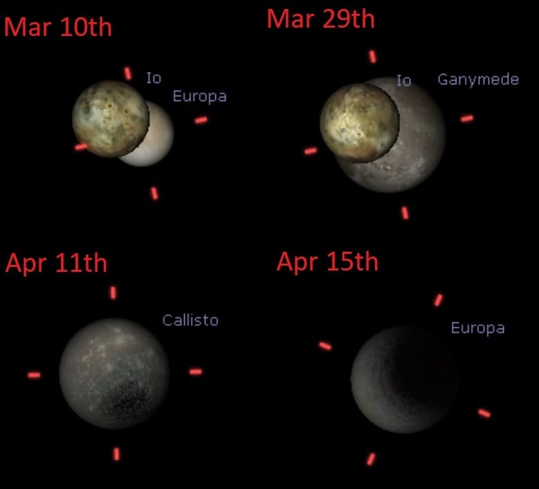 Mutual event season occurs because the orbits of the Jovian moons are tilted by a slight few degrees relative to our perspective, similar to the orbit of our own Moon versus the ecliptic. This means that the orbits of the moons are edge-on twice per one Jupiter orbit around the Sun, or about once every five years. This last occurred in late 2015, and will happen again in 2026. Once the season is underway, an enthralling set of eclipses and occultations occur, as moons alternately cast shadows on, and pass one in front of another. Sometimes, a given moon might dim just a fraction of a magnitude in brightness as a shadow deals it a glancing blow… on other occasions, it might disappear completely.