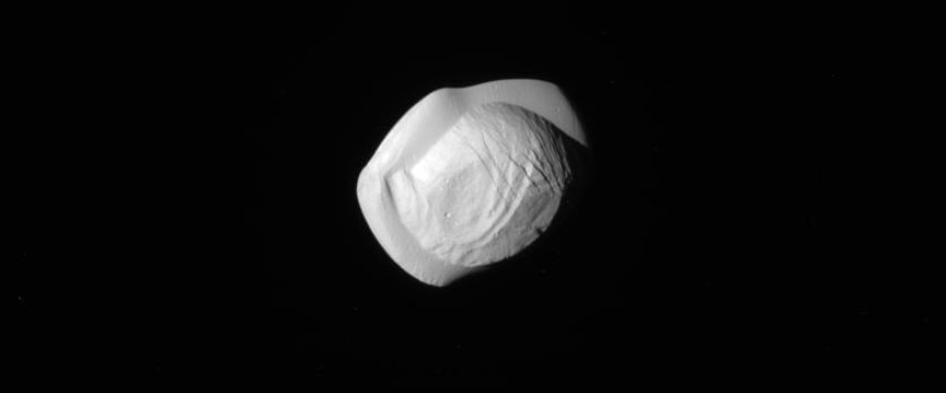The two-part structure of the moon is immediately obvious: a core body with a thin, wavy ridge encircling its equator. How does such a bizarre object form in the first place? There's good reason to believe that Pan was once part of a larger satellite that broke up near Saturn long ago. Much of the material flattened out to form Saturn's rings while large shards like Pan and another ravioli lookalike,