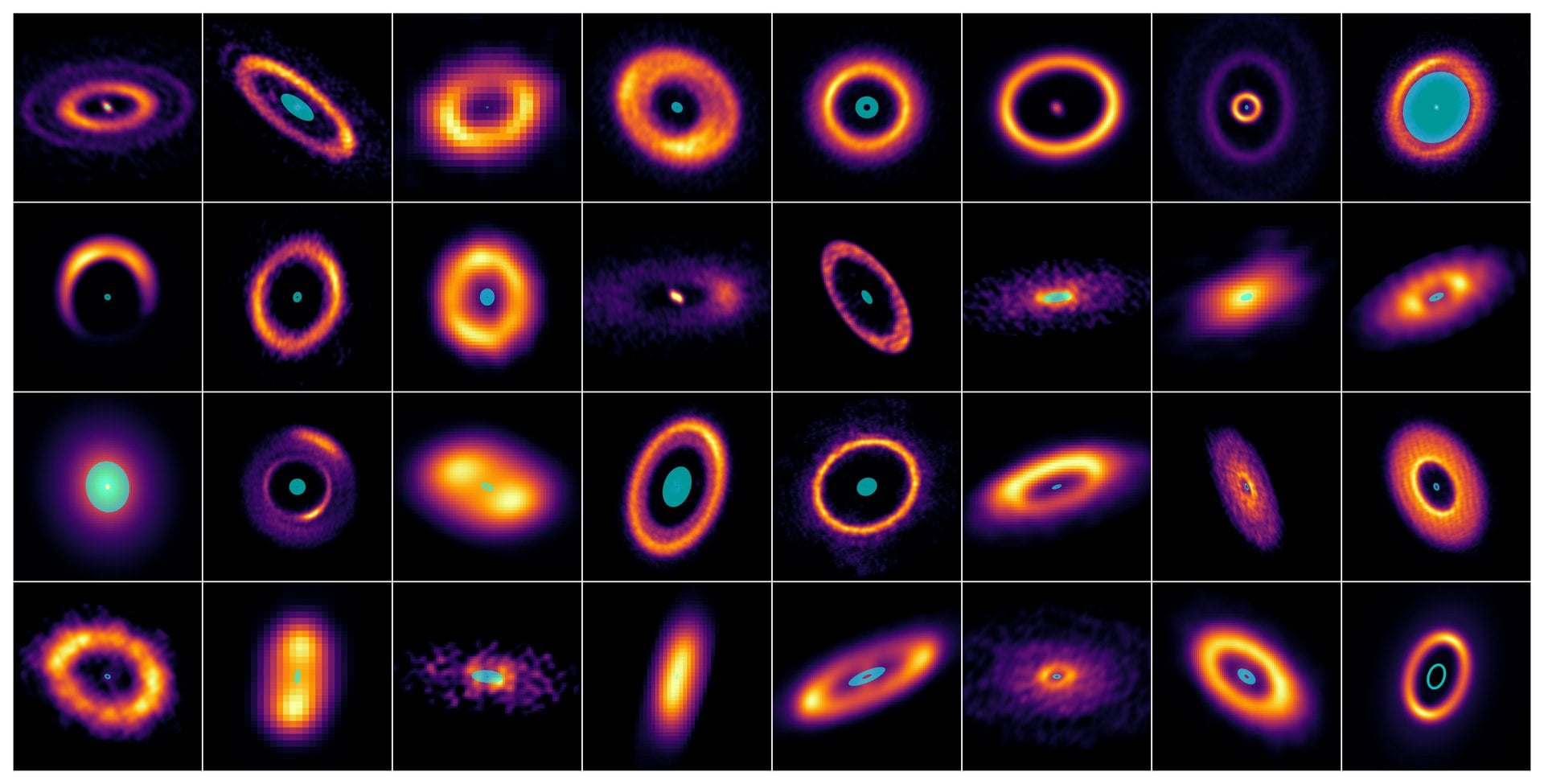 A collage of 32 glowing discs on a black background. Each disc shows concentric rings in vivid colours: purple, orange, and yellow, with bright cyan centres. The discs vary in size and orientation, creating a striking pattern of circular and elliptical shapes (Credit : ESO, ESA/Gaia/DPAC, M. Vioque et al.)