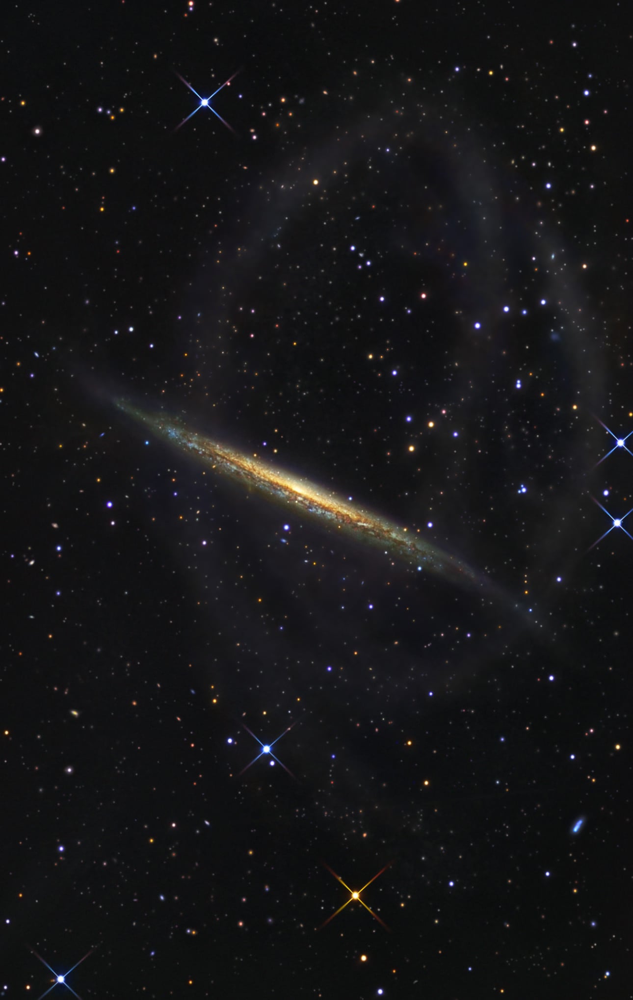 The sprawling northern constellation of Draco is home to a monumental galactic merger which left a singular spectacle - NGC 5907. Surrounded by an ethereal garment of wispy star trails and currents of stellar material, this spiral galaxy is the survivor of a "clash of the dragons" which may have occurred some 8 to 9 billion years ago. Recent theory suggests galaxies of this type may be the product of a larger galaxy encountering a smaller satellite - but this might not be the case. Not only is NGC 5907 a bit different in some respects, it's a lot different in others... and peculiar motion is just the beginning.