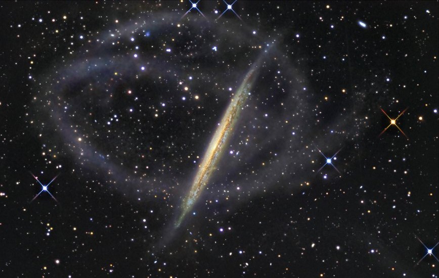 In the second spiral galaxy, NGC 4013 (50 million light-years from Earth in the constellation of Ursa Major), the ghost of another dead dwarf galaxy stretches 80,000 light-years across and is made up of old stars. Its 3D geometry is unknown, but it has similar characteristics to the Monoceros tidal stream which surrounds the Milky Way. The Monoceros tidal stream is a ring of stars, originating from a local dwarf galaxy that was eaten by our galaxy over 3,000 million years ago.