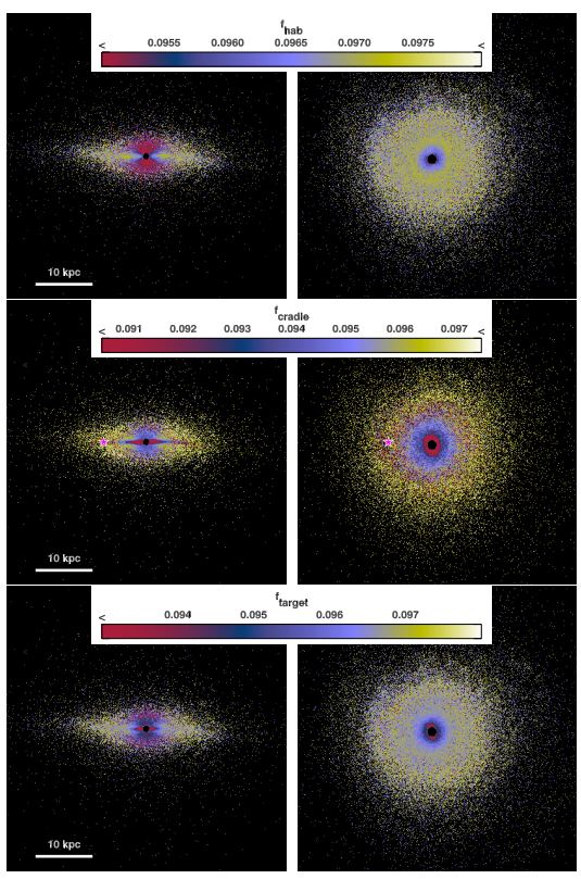 A three-panel figure from the paper showing a projected column at z = 0 and in a 1 kpc-wide slice passing through the center of g15784. The top shows the median value for natural habitability, the middle shows the fraction of possible cradles in the simulated galaxy, and the bottom shows the fraction of possible colonization targets. The magenta star shows where the Sun would be if this were the Milky Way. Image Credit: Gobat et al 2021.