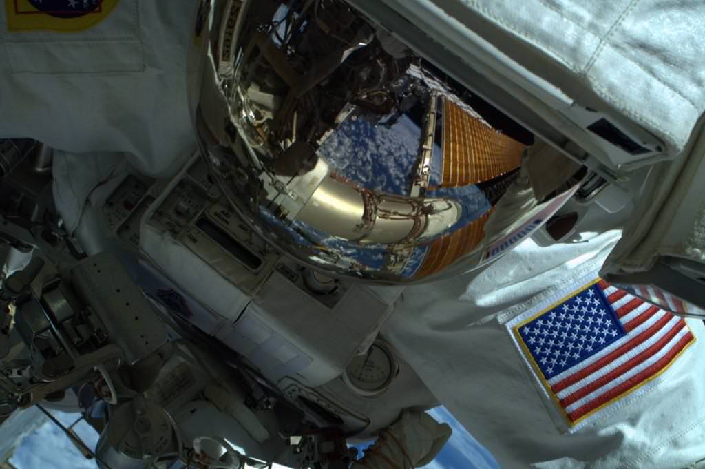 cinches up cables of wireless antenna system that provides helmet cam views of . — Intl. Space Station (@Space_Station)