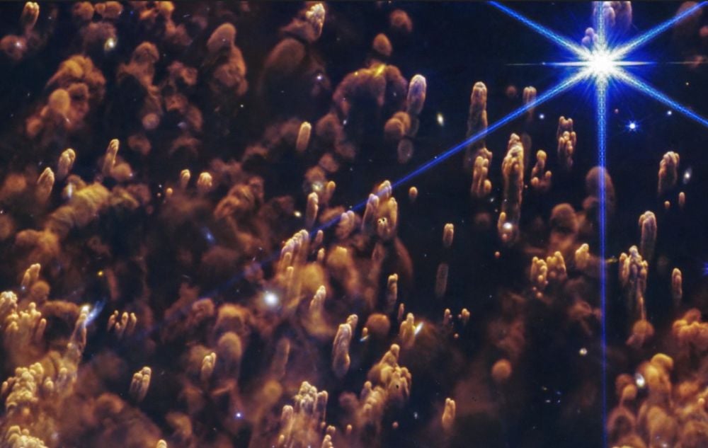 This stunning JWST image shows a small portion of the Helix Nebula. It's about one light-year across. It's a composite of separate exposures acquired by the James Webb Space Telescope using its NIRCam instrument. Different wavelength filters were used and separate colours applied were applied to each filtered exposure. Image Credit: NASA, ESA, CSA, STScI; Image Processing: Alyssa Pagan (STScI)