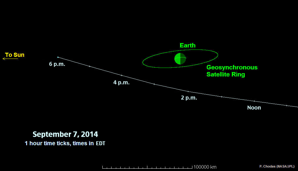 2014 RC will pass along the outer edge of the geosynchronous satellite belt, home to many weather and communications satellites. The chance of a hit is close to infinitesimal. Click for more information and detailed finder charts. Credit: SatFlare[/caption]