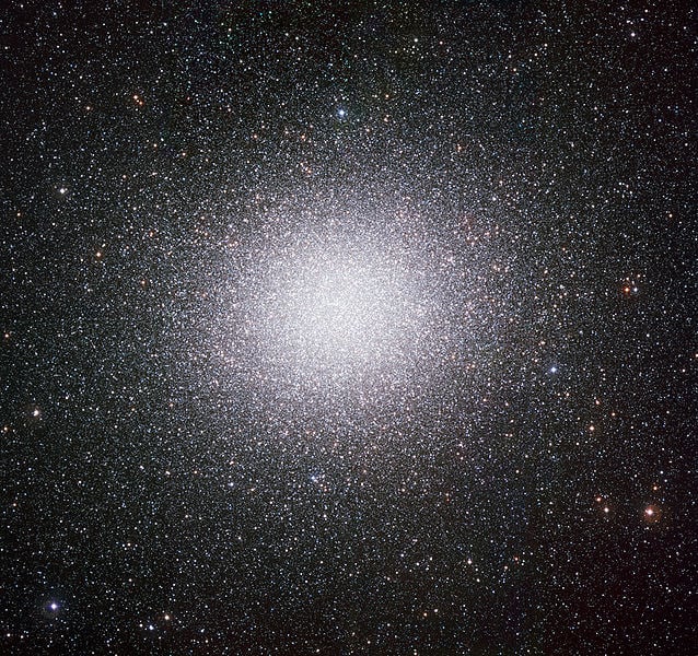 associated with our Milky Way Galaxy, Omega Centauri is almost 16,000 light years distant and weighs in at an estimated 4 million solar masses. Globular clusters are ancient structures and Omega Centauri contains millions of Population II stars dating from an age of about 12 billion years ago. The density at the core of the cluster is equal to a star per every 1/10