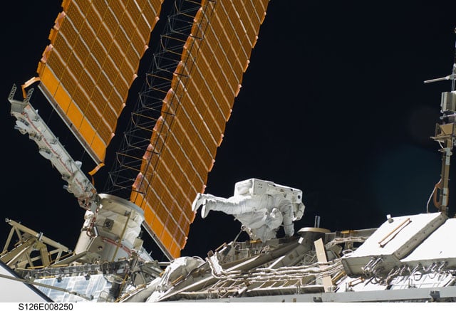 [/caption] Heidemarie Stefanyshyn-Piper and Steve Bowen work in tandem near a truss structure during one of four spacewalks conducted during the STS-126 mission. [caption id="attachment_21549" align="alignnone" width="580" caption="Astronauts install a new component. Credit: NASA"]