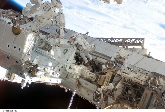 Bob Behnken continues his work on Dextre during his EVA. During the 6-hour, 53-minute spacewalk, Linnehan and Behnken installed a spare-parts platform and tool-handling assembly for Dextre. They also checked out and calibrated Dextre's end effector and attached critical spare parts to an external stowage platform. The new robotic system is scheduled to be activated on a power and data grapple fixture located on the Destiny laboratory today.