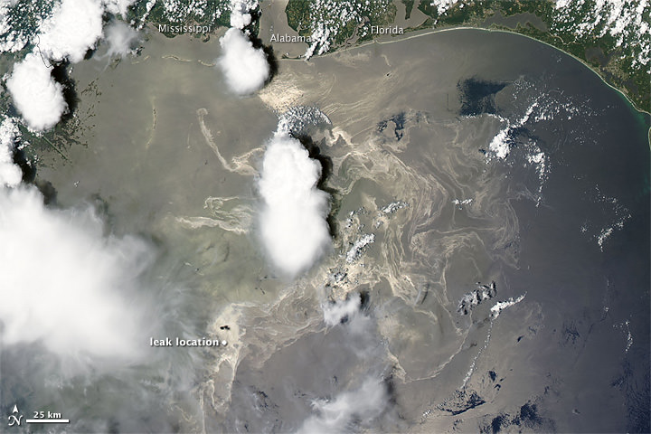 Here's the latest satellite image of the BP oil leak in the Gulf of Mexico. The oil keeps spreading towards the northeast, and appears as a maze of silvery-gray ribbons in this image from the Moderate Resolution Imaging Spectroradiometer (MODIS) on NASA's Terra satellite. The MODIS team said that the spot of black just north of the location of the oil well may be smoke; reports from the National Oceanic and Atmospheric Administration say that oil and gas continue to be captured and burned as part of the emergency response efforts.