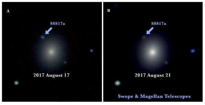 New images of the afterglow of GW170817, aka SGRB 170817A, initially designated as Swope Supernova Survey SSS17a, revealed a bright blue astronomical transient, later designated as AT2017gfo by the International Astronomical Union (IAU).