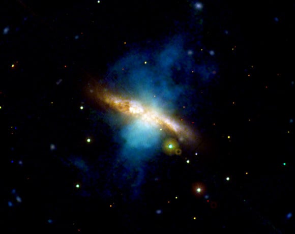 This first image shows bright knots in the plane of the galaxy, indicating a region of intense star formation, and emerging plumes of supergalactic winds glowing in X-rays.