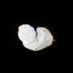 Hayabusa arrived at Itokawa on September 12. The distance between the spacecraft and Itokawa is approximately 20 kilometers. This is the composite color image of Itokawa taken at September 12, 2005. This image composed of three images with different filters as red, green and blue. The irregular shape is clearly seen. Hayabusa science observations started.