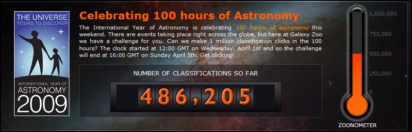 The clock started ticking at 12:00 GMT on Wednesday, April 1st, with the challenge ending at 16:00 GMT on Sunday April 5th. The Galaxy Zoo site even includes a thermometer-like gadget called the Zoonometer to provide up-to-the minute ticks on the number of clicks. If you have just returned from a cave on Mars and haven't heard of
