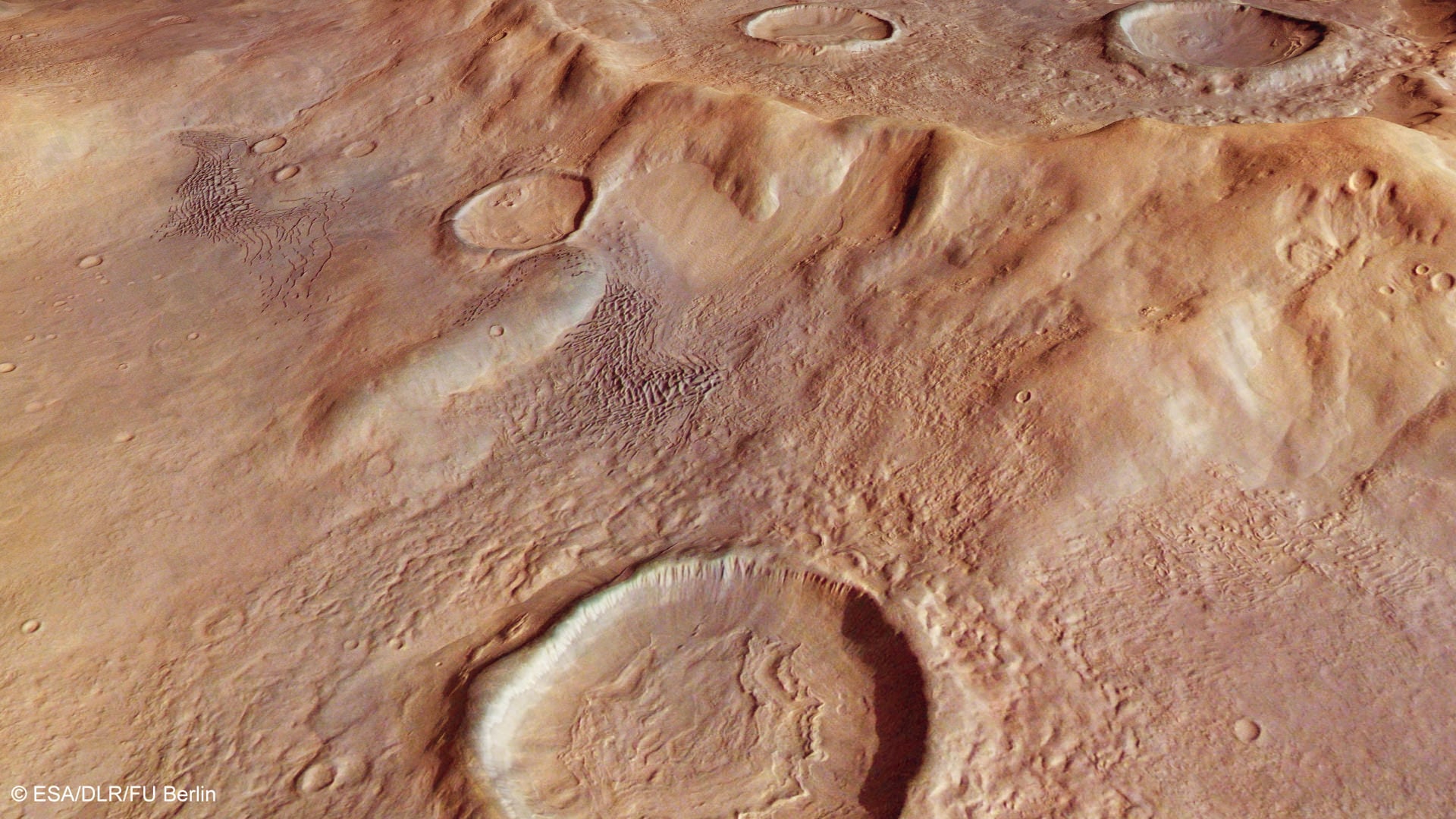 The wrinkled view of that crater in front is a product of snowing and freezing that took place when the Martian surface was wetter, ESA said.