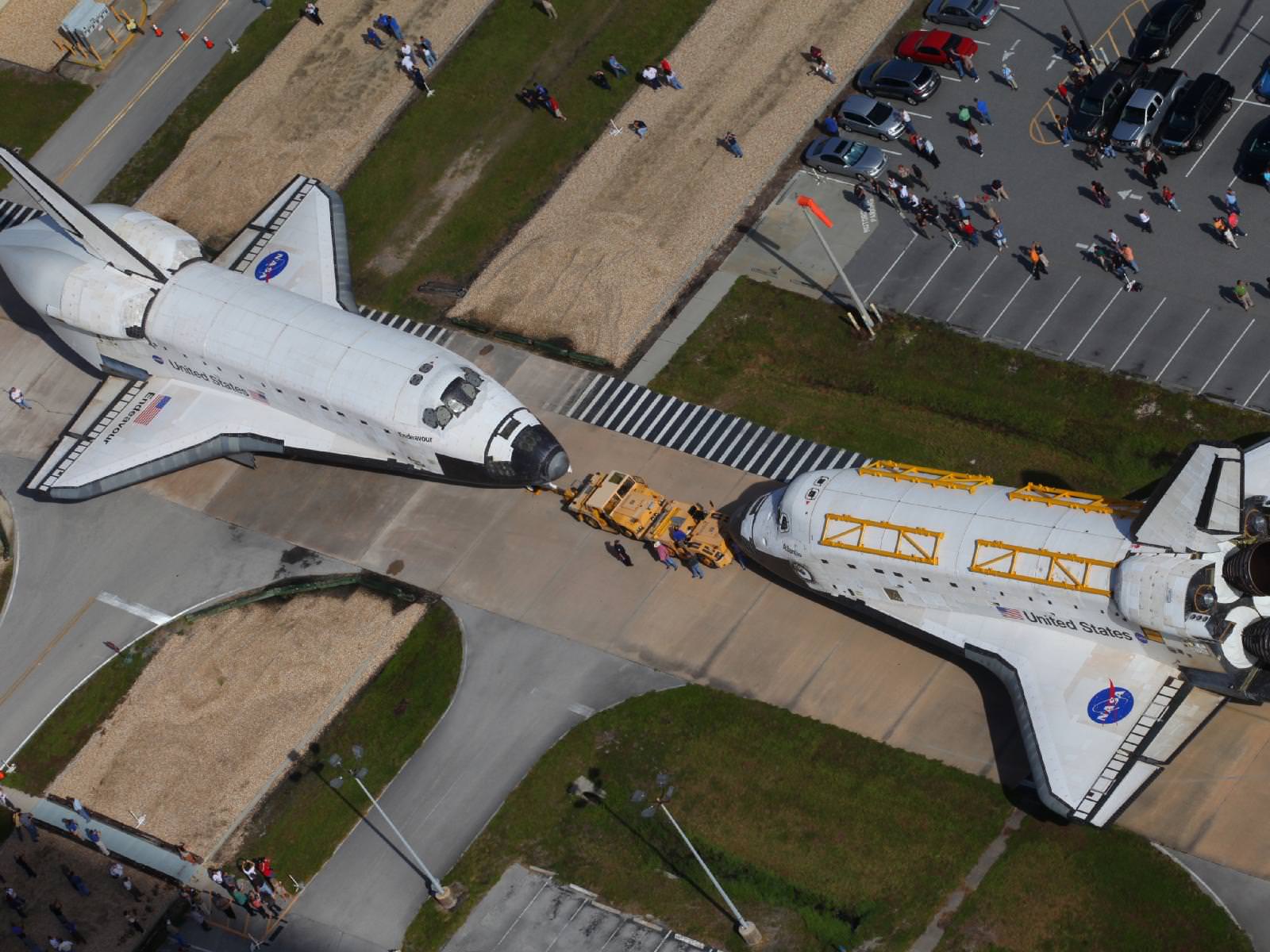 This is a sight that will probably never be seen again: two space shuttles nose-to-nose in the same location. NASA's space shuttles Endeavour and Atlantis switched locations today at Kennedy Space Center in Florida, and met each other for the last time in front of Orbiter Processing Facility 3.