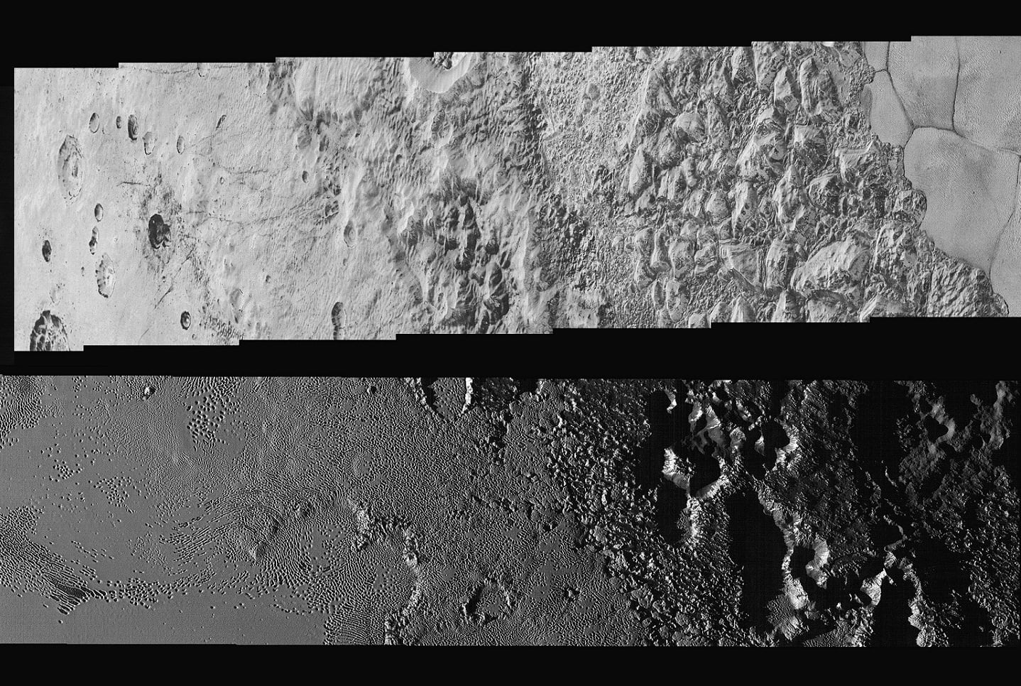 These images, which were taken while the New Horizon's probe was still 15,850 km (9,850 mi) away from Pluto (just 23 minutes before it made its closest approach), extend across the hemisphere that the probe was facing as it flew past. It shows features ranging from the cratered northern uplands and the mountainous regions in Voyager Terra before slicing through the flatlands of "Pluto's Heart" - aka. Tombaugh Regio - and ending up in another stretch of rugged highlands.