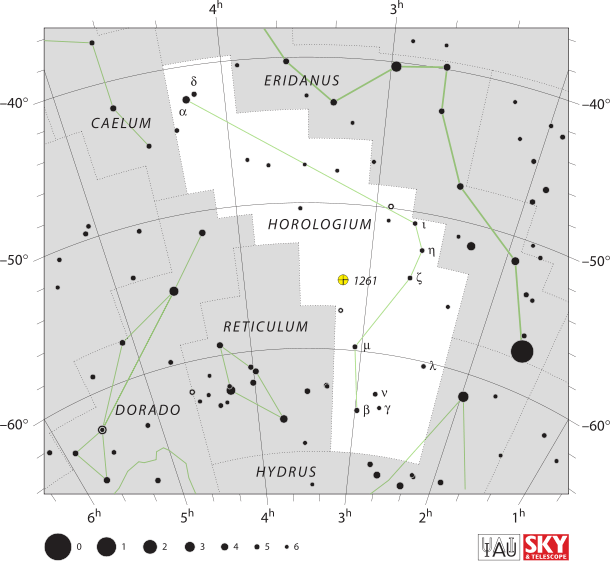Horologium spans 249 square degrees of sky and consists of 6 mains stars in the asterism, with 10 Bayer/Flamsteed designated stars. It is bordered by the constellations of Eridanus, Hydrus, Reticulum, Dorado and Caelum. Horologium is visible to all observers at latitudes between +30° and ?90° and is best seen at culmination during the month of December.