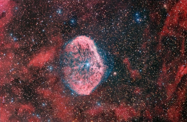 Spanning some 25 by 18 light years, gazing at NGC 6888 means we are looking 4700 years into the past, a past that renders a nebula fueled and excited by the blue star at the center. And not just any blue star - but a high mass super-giant star - one that depleted its fuel at "full speed". Not only was it a super giant, but hot... in the class of "Wolf Rayet" stars (HD 192163). Now, after only a couple of million years the "stellar gas" is almost used up and the star is standing right before a significant change: a supernova candidate. Behold a star that vents its outer layers into space at terrific speed!
