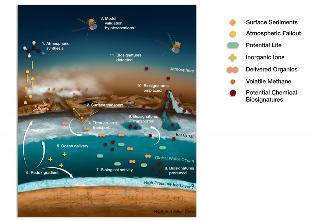 Their first objective is to figure out how organic molecules might move around the planet, and be transported from the atmosphere, to the surface, and then into the subsurface ocean.