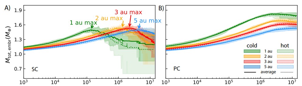 The most significant mass loss is when the exomoons are in cold disks within 1 AU of the star, as panel A shows above. In that situation, the disk loses between 30% and 40% of its mass. Panel B shows that while embryos lose mass in the planet-centred simulation, it's not as extreme. They retain more than 90% of their initial mass.