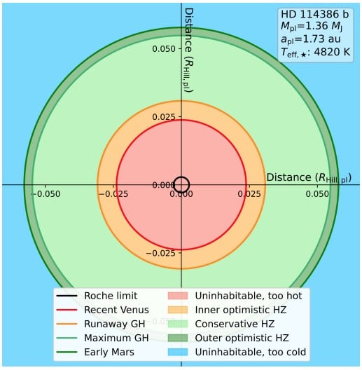 *This figure from the research shows the situation for a hypothetical moon experiencing tidal heating around the exoplanet HD 114386 b. The Conservative HZ is bounded by the Runaway Greenhouse line and the Maximum Greenhouse line. Image Credit: Dencs et al. 2025, A&A*