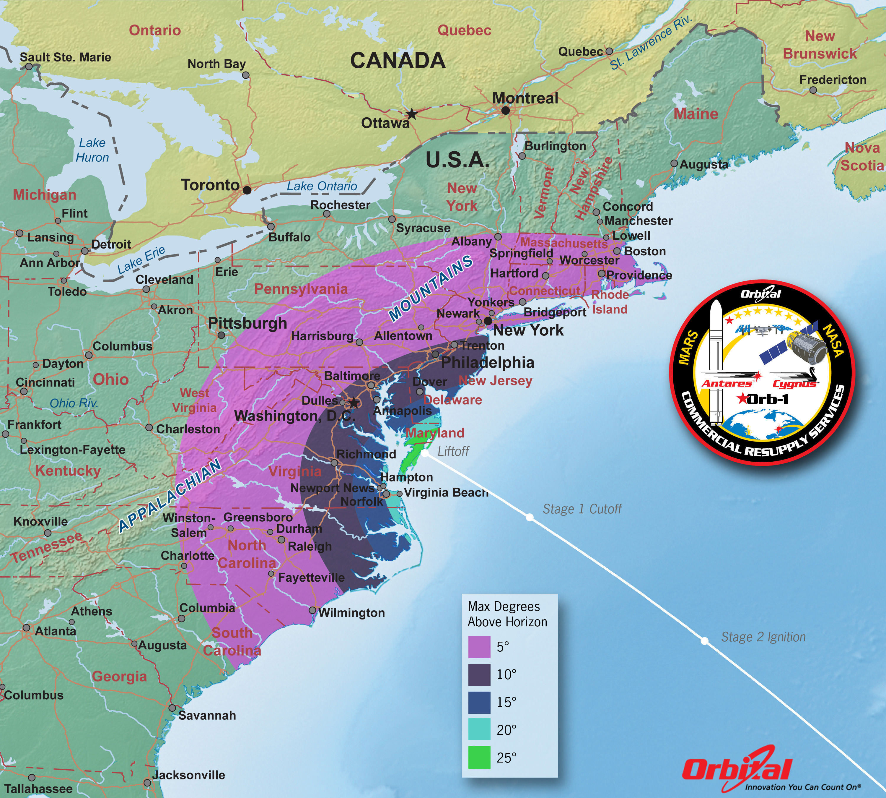 The Antares nighttime launch will be visible to millions of spectators across a wide area of the Eastern US -weather permitting. This map shows the maximum elevation (degrees above the horizon) that the Antares rocket will reach during the Dec 19, 2013 launch depending on your location along the US east coast. Credit: Orbital Sciences[/caption]