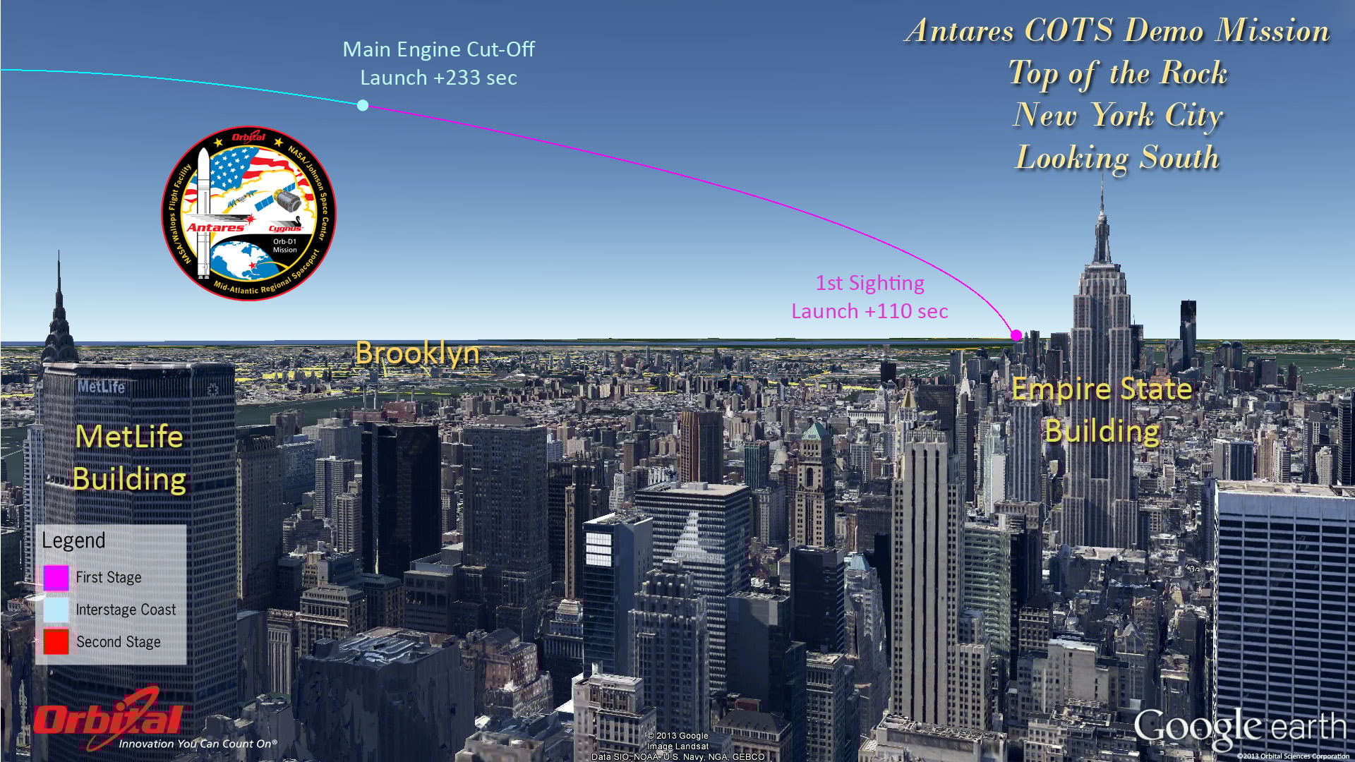 Top of the Rock - New York City Antares rocket and Cygnus cargo spacecraft approximate launch trajectory view as should be seen from atop Rockefeller Center, NYC, on Sept. 18, 2013 at 10:50 a.m. EDT - weather permitting - after blastoff from NASA Wallops, VA. Credit: Orbital Sciences