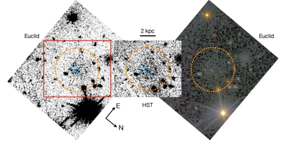 *This figure is made up of cutout images from Euclid's VIS and the Hubble's Advanced Camera for Surveys. The central part stacks both images from the Hubble's ACS and shows extremely diffuse emissions around CDG-2s's four GCs. Euclid data confirms it. Image Credit: Li et al. 2026. ApJL*