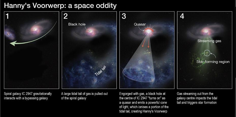 The press release goes on to state that recent X-ray observations have revealed why Hanny's Voorwerp caught the proverbial eye of astronomers. The galaxy's rambunctious core produced a quasar, a powerful light beacon powered by a black hole. The quasar shot a broad beam of light in Hanny's Voorwerp's direction, illuminating the gas cloud and making it a space oddity. Its bright green color is from glowing oxygen. "We just missed catching the quasar, because it turned off no more than 200,000 years ago, so what we're seeing is the afterglow from the quasar," Keel says. "This implies that it might flicker on and off, which is typical of quasars, but we've never seen such a dramatic change happen so rapidly."