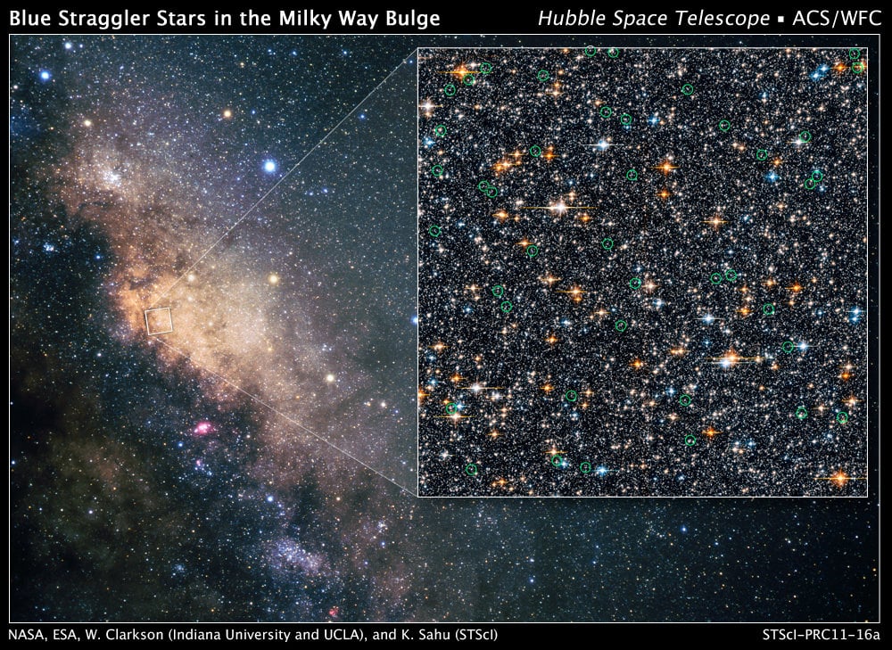 Astronomers using the Hubble Space Telescope to peer deep into the central bulge of our galaxy have found a population of rare and unusual stars. Dubbed "blue stragglers", these stars seem to defy the aging process, appearing to be much younger than they should be considering where they are located. Previously known to exist within ancient globular clusters, blue stragglers have never been seen inside our galaxy's core – until now.