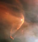 The material in the fast wind from LL Ori collides with slow-moving gas evaporating away from the center of the Orion Nebula, which is located to the lower right in this Heritage image. The surface where the two winds collide is the crescent-shaped bow shock seen in the image.