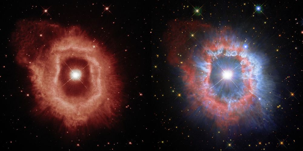 AG Carinae has suffered multiple outbursts, most likely. Hydrogen and nitrogen make up most of the gas, seen in red, and there appear to be multiple rings, evidence of multiple outbursts. It's possible that individual rings from individual outbursts have collided with one another. The blue dust is not in the shape of rings but is formed into clumps, filaments, and bubbles, probably by the stellar wind. AG Carinae's stellar winds are extraordinarily powerful. Massive stars like it have winds that can be one billion times more powerful than our Sun's stellar winds.
