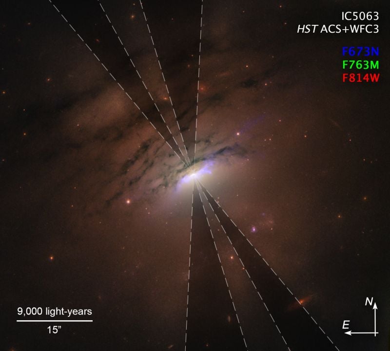 So the venerable Hubble Space Telescope, as aged as it is, was put to use. Despite the Hubble being upstaged by more modern and powerful telescopes in recent years, it still has keen eyes. It used its Wide Field Camera 3 and Advanced Camera for Surveys to peer into IC 5063 in the near-infrared. Near-infrared light pierces through the dust to reveal more detail of the structure of the galaxy.