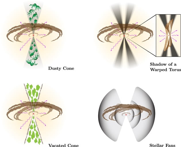 The angle of the cones of light relative to the galaxy's orientation are a big clue to the source of the rays and shadows. In their paper the authors write that "The orientation of the bicone relative to the galactic plane suggests a striking possibility: if the excess light at bright angles results from reflection of AGN emission off of diffuse galactic dust, then the dark rays could be the projected shadow of nuclear dust (possibly the torus), cast by AGN light."
