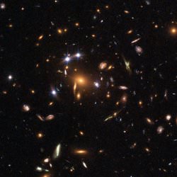 The Hubble picture also shows a large number of stretched arcs that are more distant galaxies lying behind the cluster, each of which is split into multiple distorted images. The most distant galaxy identified and confirmed so far is 12 billion light-years away (corresponding to only 1.8 billion years after the Big Bang).