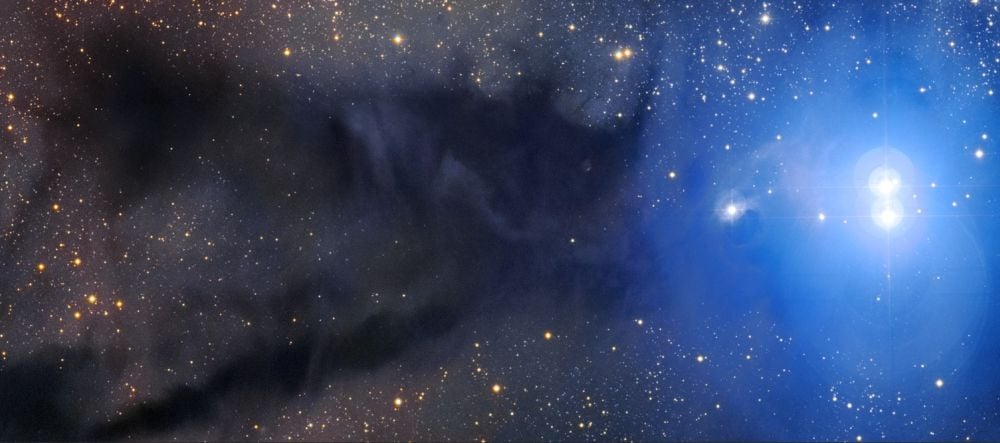 *This image of Lupus 3 comes from the VLT Survey Telescope and the MPG/ESO 2.2-metre telescope. It shows the dark Lupus 3 cloud, as well as a pair of hot young stars named HR 5999 and HR 6000 that have formed in it. Their light has created a blue reflection nebula named Bernes 149. Image Credit: ESO/R. Colombari*