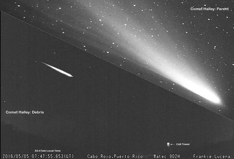 A family portrait, of an Eta Aquariid meteor and Halley's Comet. Credit: Frankie Lucena.
